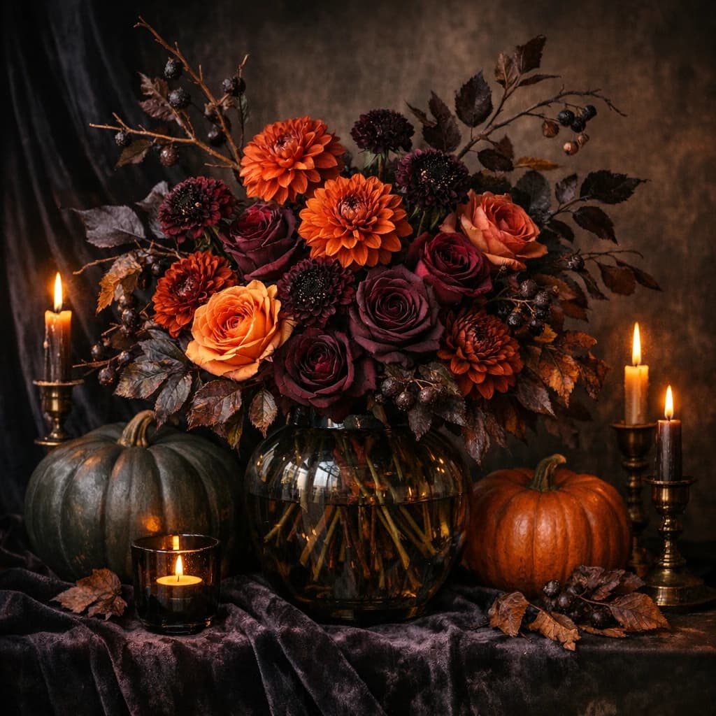Halloween flowers, moody autumn centerpieces, and dramatic bouquets with pumpkin, plum, and burgundy styling for Van Nuys delivery.
