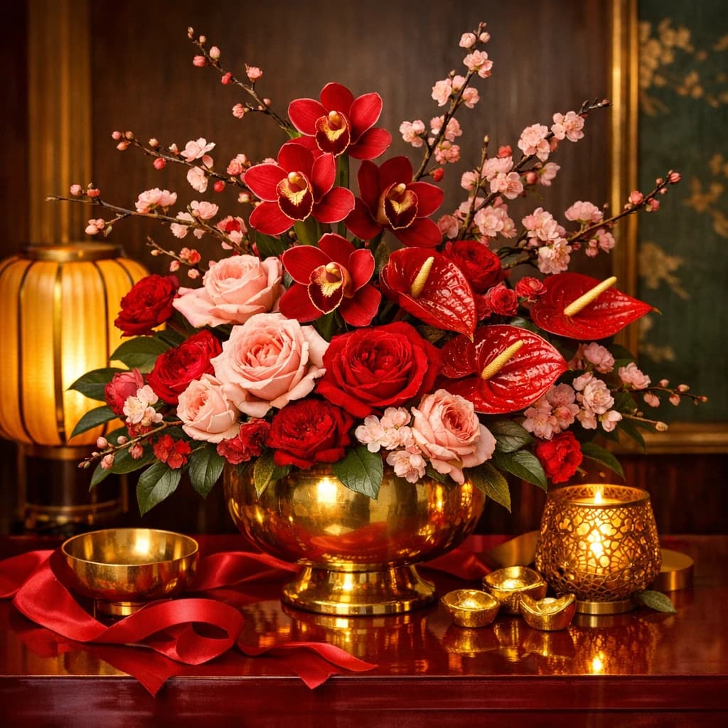 Lunar New Year flowers with rich red, gold, blush, and orchid-driven palettes for family celebrations, gifting, and elevated table styling in Van Nuys.