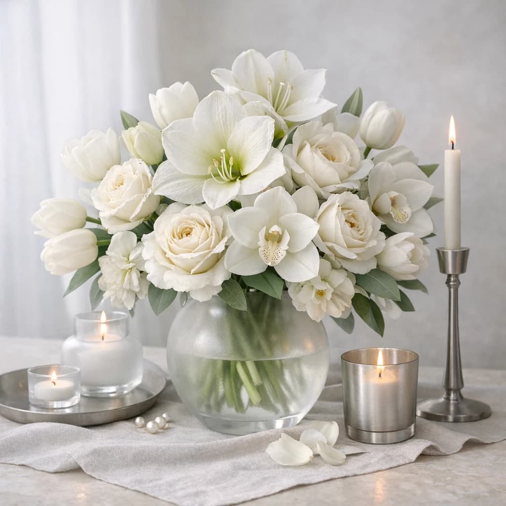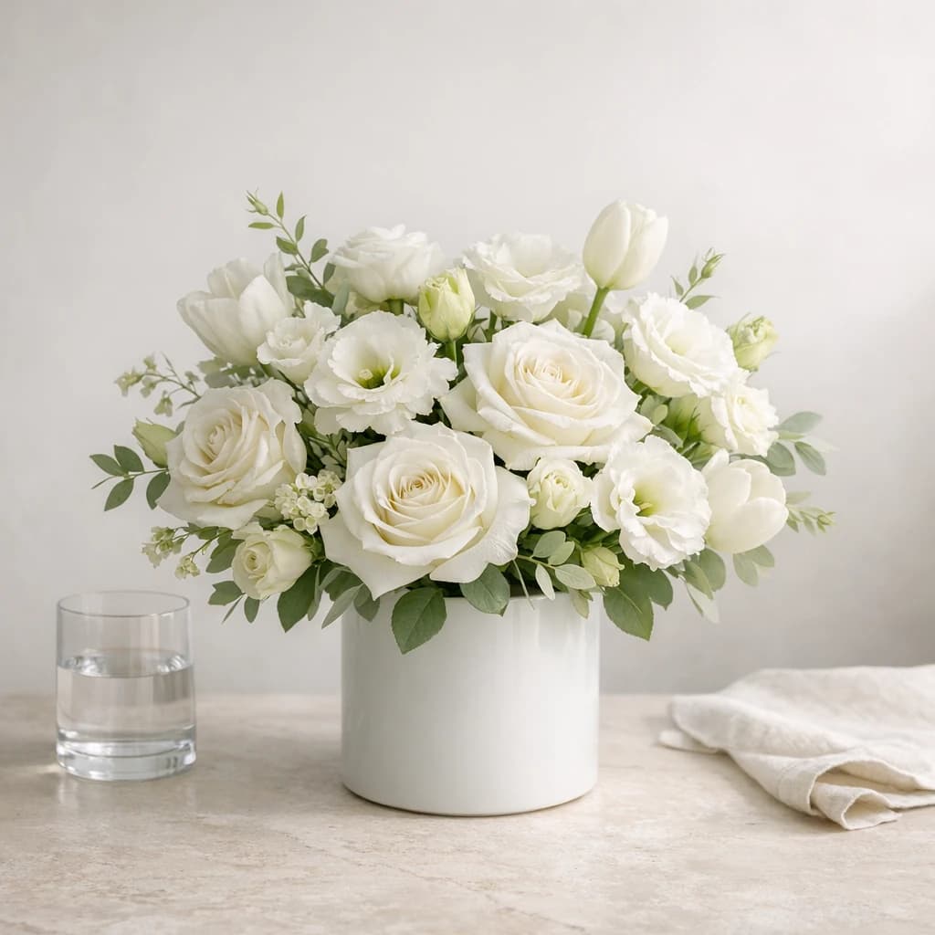 Yom Kippur flowers with serene whites, pale greens, and restrained styling for reflective home settings and respectful Van Nuys delivery.