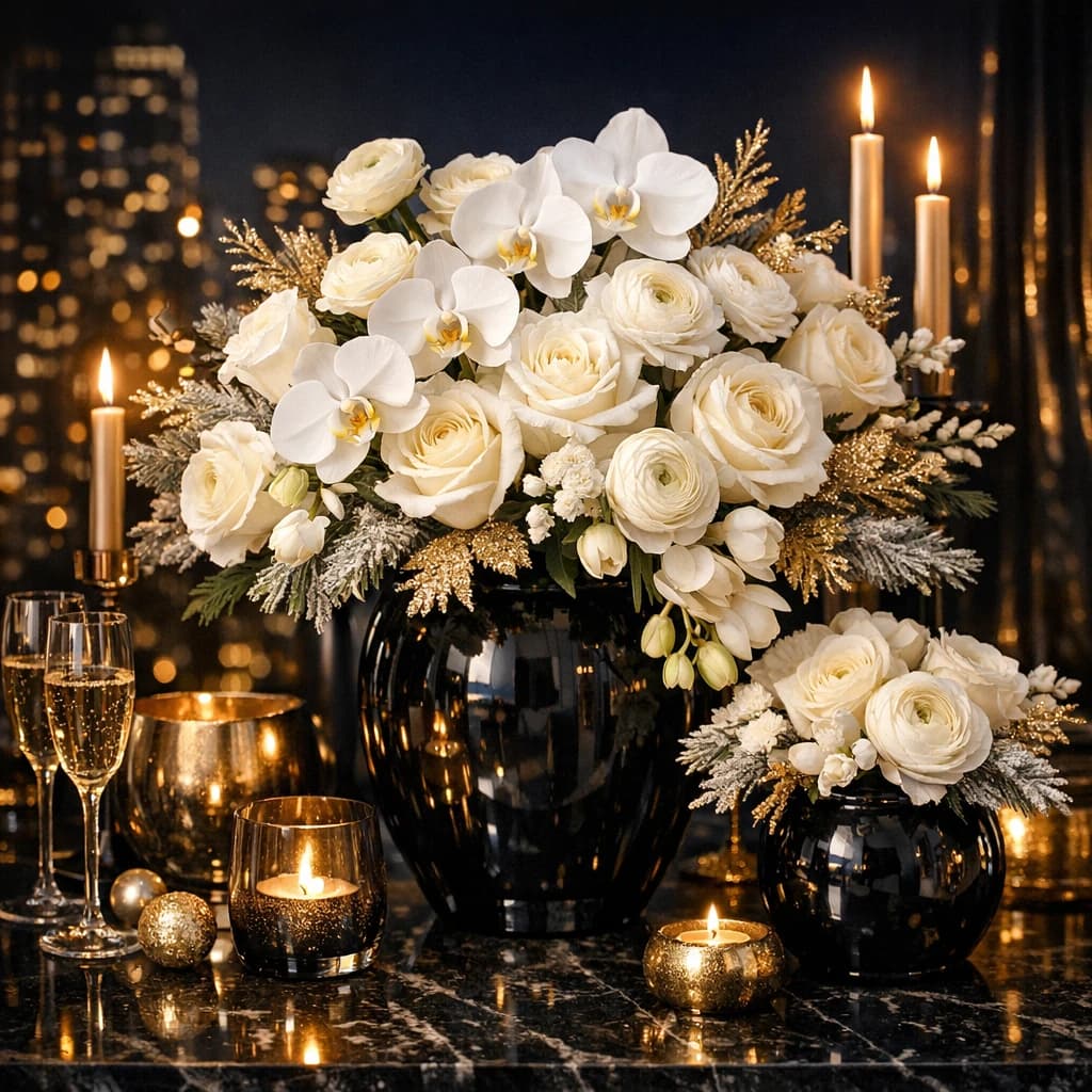 New Year's Eve flowers, party centerpieces, and champagne-toned arrangements for elegant year-end hosting and Van Nuys delivery.