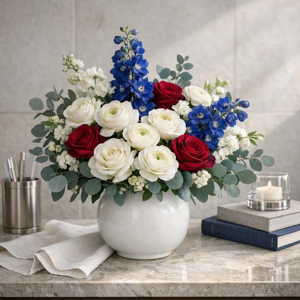 Memorial Day flowers, respectful centerpieces, and refined red-white-and-blue arrangements for remembrance, hosting, and local delivery in Van Nuys.